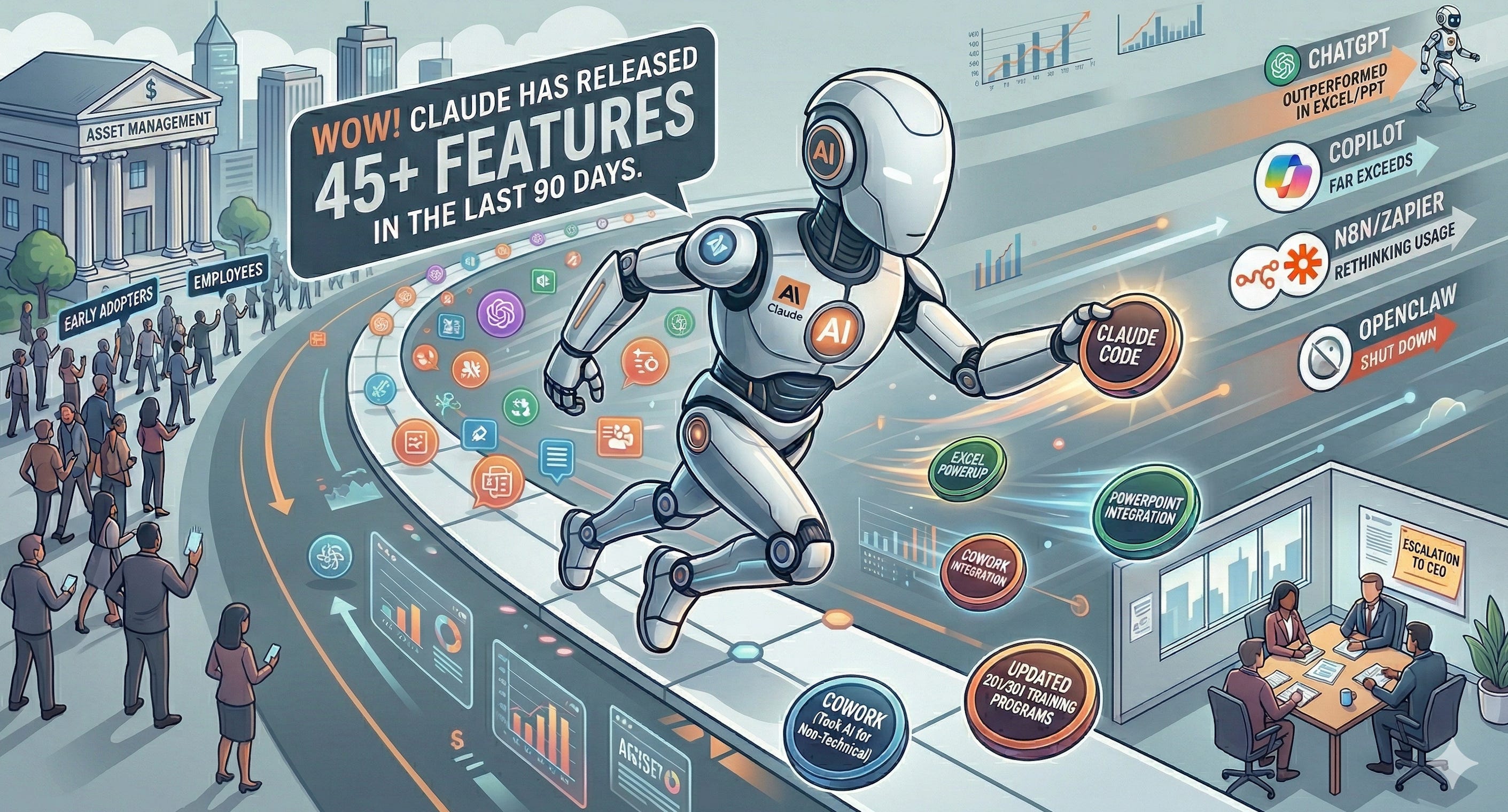 A: Claude now outperforms ChatGPT in Excel and PowerPoint add-ins and significantly exceeds Microsoft Copilot in both. Anthropic shipped more than 45 new features in 90 days, including file creation for Excel, PowerPoint, and PDF, persistent memory, and a desktop agent called Cowork that replaces workflow tools like Zapier and N8N. For non-technical employees, Claude Cowork requires no coding and executes multi-step tasks autonomously.