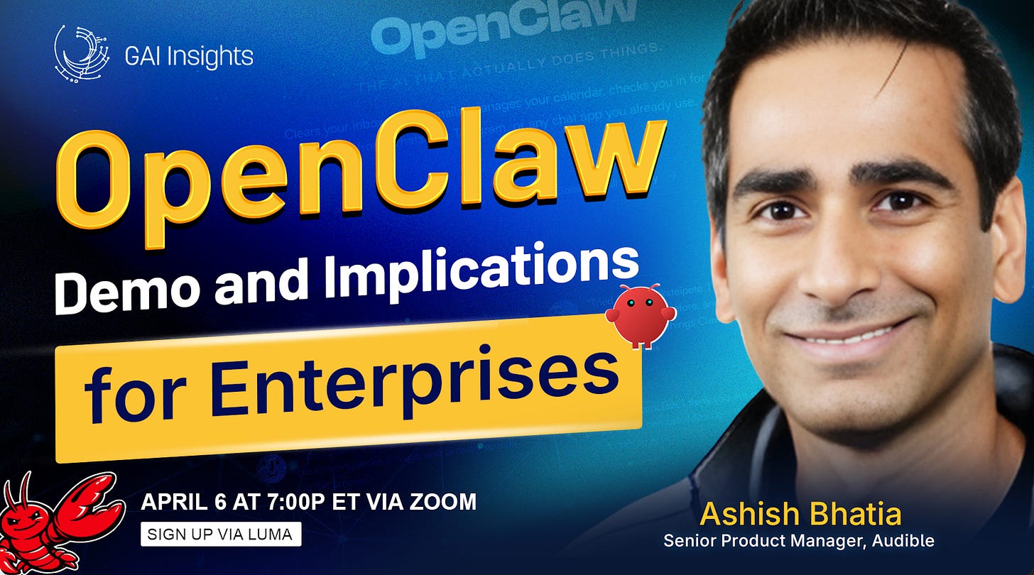 Join us Monday April 6, at 7p ET / 4p PT to see a demo OpenClaw (a Personal AI Agents) and to discuss the implications for companies. Claude is already matching some of these features and ChatGPT is expected to as well. Register here (142 have already registered).